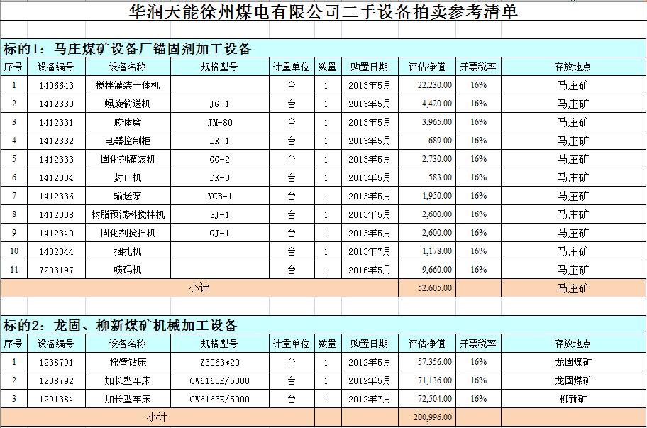 關(guān)注微信公眾號(hào)我公司受委托,定于2018年9月18日10時(shí)在徐州市中山南路55號(hào)副樓三樓本公司拍賣大廳公開拍賣:徐州市馬莊煤礦、大劉煤礦、龍固煤礦、沛城煤礦、柳新煤礦的二手設(shè)備一批。