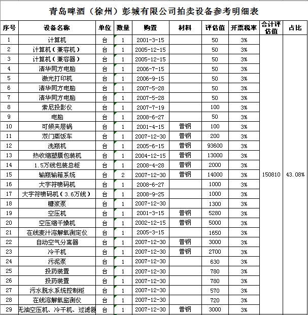 關(guān)注微信公眾號受委托,我公司定于2018年 9月28日10:00通過中國拍賣行業(yè)協(xié)會網(wǎng)絡(luò)拍賣平臺以網(wǎng)絡(luò)競價的方式公開拍賣:青島啤酒(徐州)彭城有限公司廢舊設(shè)備一批,主要包括:洗瓶機、灌酒壓蓋機、殺菌機、包裝機、輸瓶輸箱系統(tǒng)、辦公設(shè)備等。