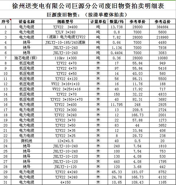 關(guān)注微信公眾號(hào)受委托,我公司將通過中國(guó)拍賣行業(yè)協(xié)會(huì)網(wǎng)絡(luò)拍賣平臺(tái)以網(wǎng)絡(luò)競(jìng)價(jià)的方式公開拍賣廢舊電力物資一批,主要包括:電纜、導(dǎo)線、廢舊鋼材、鋼芯鋁絞線、金具、雜品、機(jī)具、空調(diào)、辦公設(shè)備等。