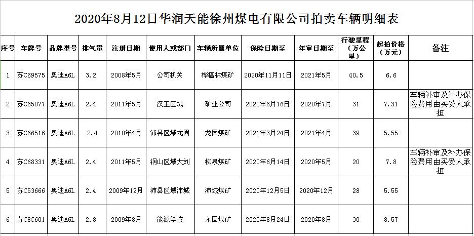 關(guān)注微信公眾號(hào)受委托,我公司定于2020年8月12日14:00時(shí)通過中拍平臺(tái)和現(xiàn)場(chǎng)結(jié)合方式公開拍賣:華潤天能徐州煤電有限公司奧迪公務(wù)車6輛。