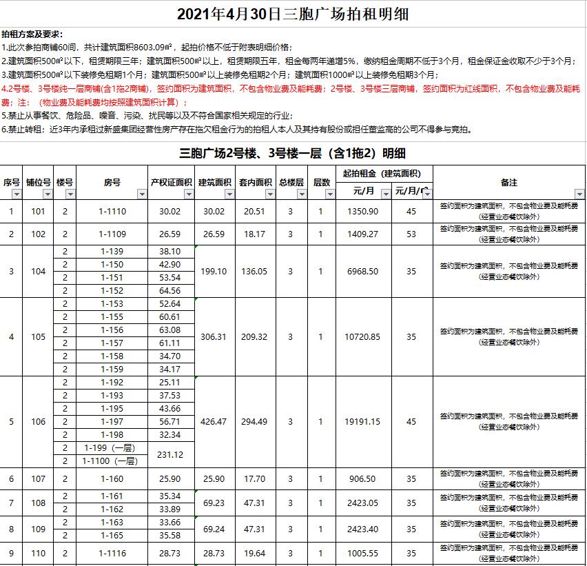 關注微信公眾號我公司受委托,定于2021年4月30日10時在徐州市中山南路55號三樓本公司拍賣廳公開拍租:新盛集團位于三胞廣場商鋪及辦公房一批,面積分別為數(shù)十至數(shù)百平米不等,均為閑置。租期3-5年。禁止從事危險品、有污染及擾民的行業(yè)經營。