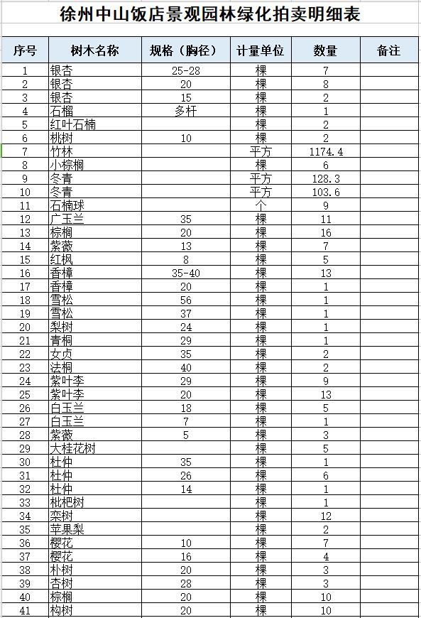 關(guān)注微信公眾號 受委托,我公司定于2021年5月8日10通過中拍平臺公開拍賣:徐州市中山飯店景觀樹一批。主要包含:銀杏、廣玉蘭、冬青、紫薇、香樟、梨樹、松鼠、青桐、女貞、法桐、白玉蘭、杜仲、水杉、冬青、海棠、竹林等。
