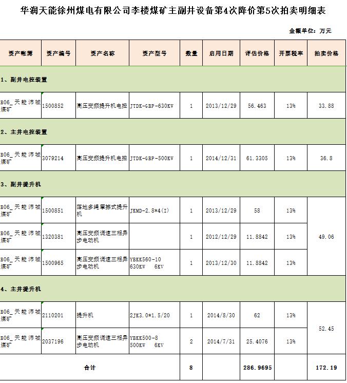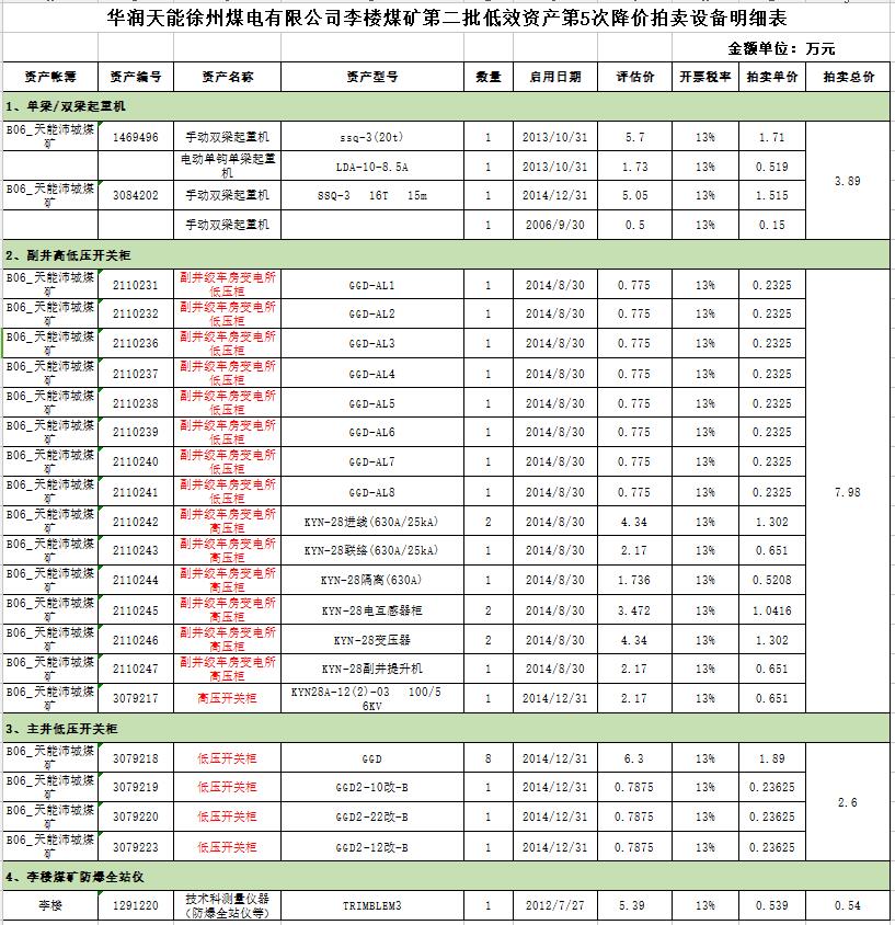 2、華潤天能李樓煤礦二手礦用設備一批。主要包括:主副井提升機、主副井電控裝置、單雙梁起重機、副井高低壓開關柜、主井低壓開關柜、防爆全站儀等。(保證金10萬元)